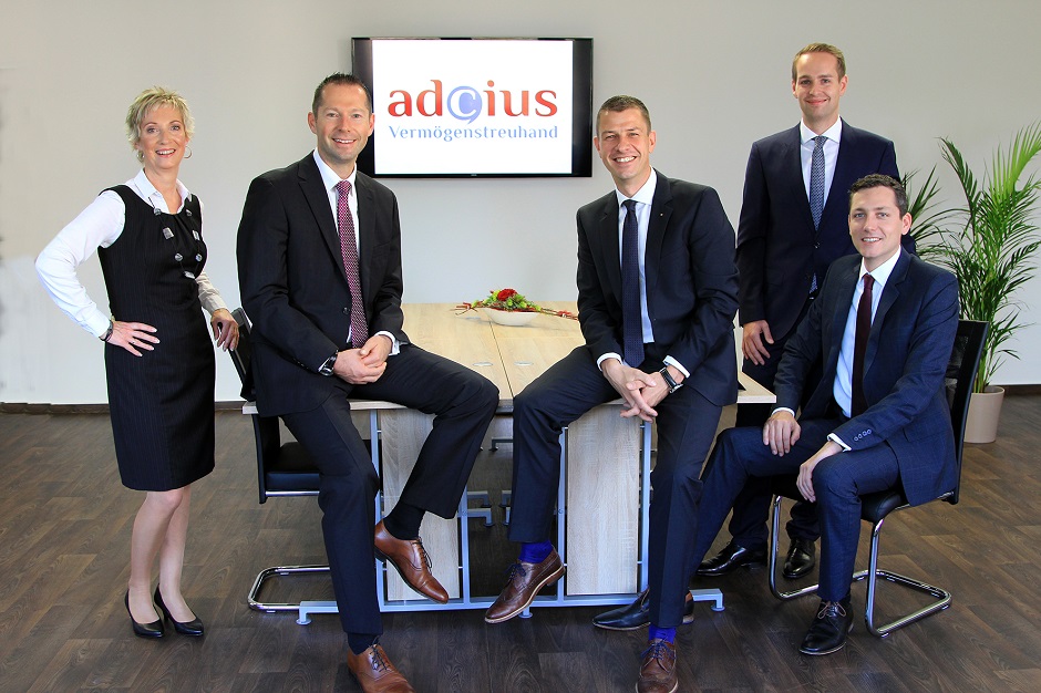 Das Team der adcius Vermögenstreuhand GmbH: Jacqueline Märker, Kai Tomczak, Tino Websky, Marcus Kühne und Daniel Gränitz (v.l.n.r.)